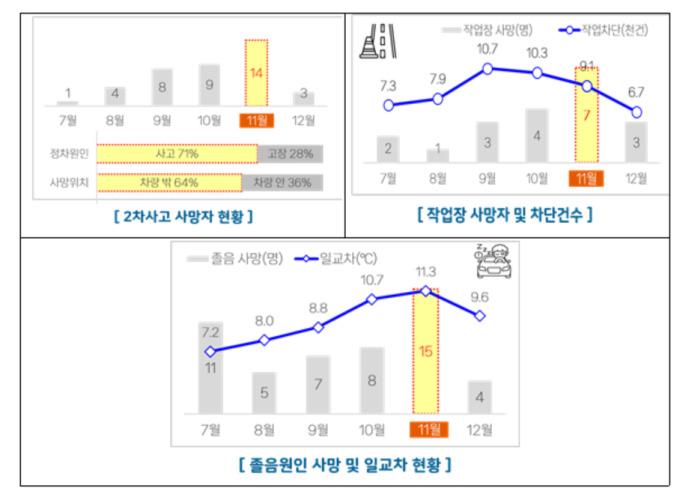 같은 기간 작업장 사고 사망자는 총 7명으로 연중 최다였다. 이는 고속도로 차단작업 건수가 월평균 7500건에서 9100건으로 약 21% 증가하는 데 따른 결과다. 여기에 일교차가 평균 11.3℃로 연중 가장 커 식후 졸음운전 사망자도 15명으로 월평균(8명)보다 두 배 가까이 많았다.