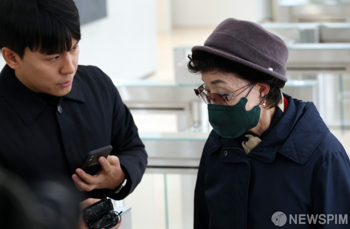 [서울=뉴스핌] 최지환 기자 = 양평 공흥지구 개발 특혜 의혹을 받는 김건희 여사의 모친 최은순 씨가 4일 오전 서울 종로구광화문 KT 빌딩에 마련된 김건희특검 사무실에 피의자 신분으로 출석하고 있다. 2025.11.04 choipix16@newspim.com