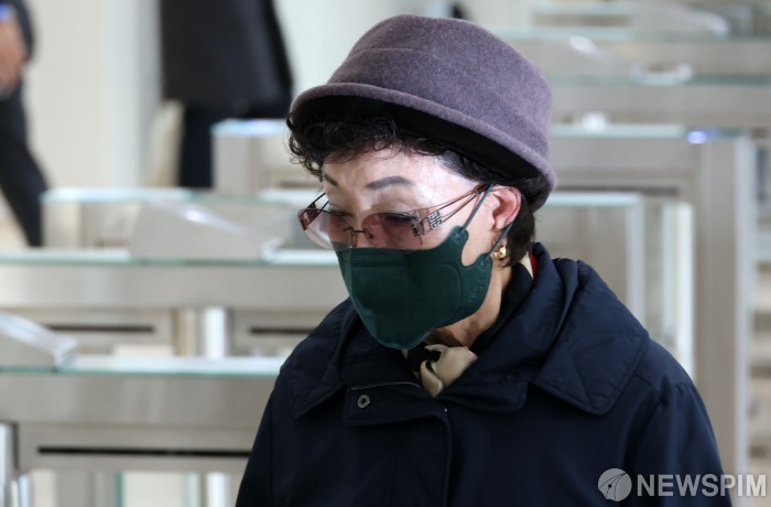 [서울=뉴스핌] 최지환 기자 = 양평 공흥지구 개발 특혜 의혹을 받는 김건희 여사의 모친 최은순 씨가 4일 오전 서울 종로구광화문 KT 빌딩에 마련된 김건희특검 사무실에 피의자 신분으로 출석하고 있다. 2025.11.04 choipix16@newspim.com