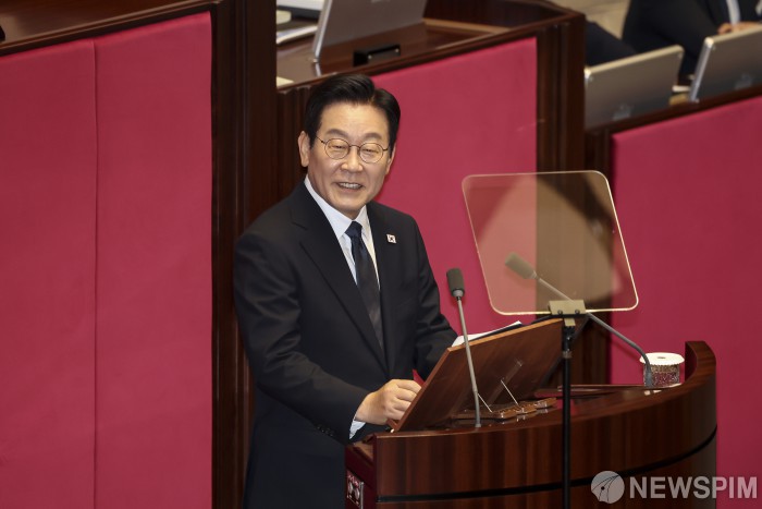 [서울=뉴스핌] 윤창빈 기자 = 이재명 대통령이 4일 서울 여의도 국회에서 열린 본회의에서 2026년도 예산안에 대한 정부의 시정연설을 하고 있다. 2025.11.04 pangbin@newspim.com