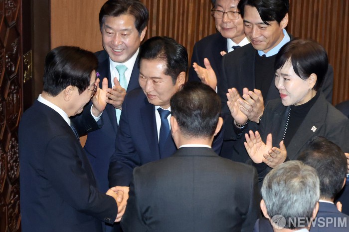 [서울=뉴스핌] 윤창빈 기자 = 이재명 대통령이 4일 국회 본회의장에서 정부 예산안 시정연설을 위해 입장하며 정청래 더불어민주당 대표와 악수하고 있다. 2025.11.04 pangbin@newspim.com