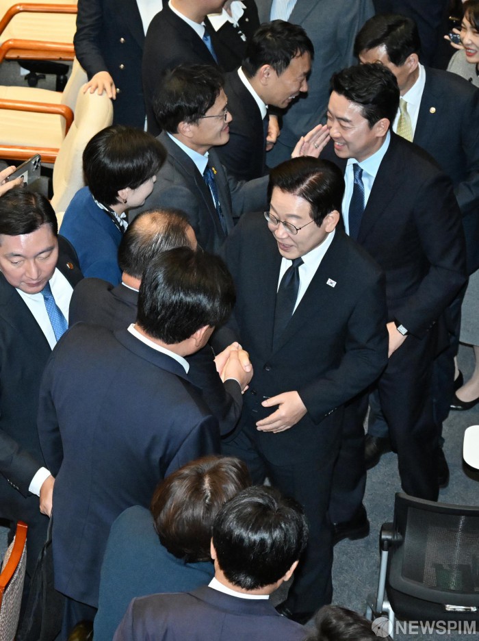 [서울=뉴스핌] 윤창빈 기자 = 이재명 대통령이 4일 국회 본회의장에서 정부 예산안 시정연설을 한 후 퇴장하며 더불어민주당 의원들과 인사하고 있다. 2025.11.04 pangbin@newspim.com