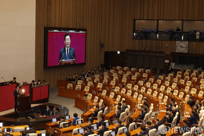[서울=뉴스핌] 윤창빈 기자 = 이재명 대통령이 4일 오전 서울 여의도 국회에서 2026년도 예산안에 대한 시정연설을 하고 있다. 2025.11.04 pangbin@newspim.com