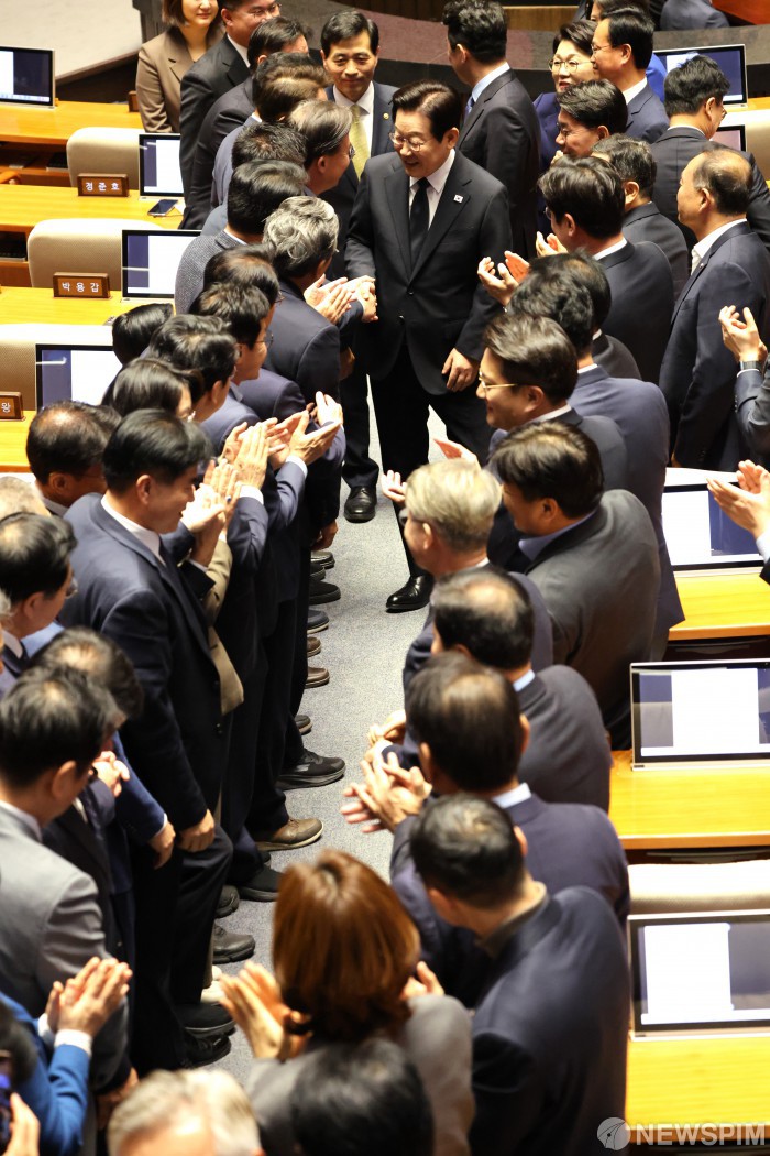 [서울=뉴스핌] 윤창빈 기자 = 이재명 대통령이 4일 서울 여의도 국회 본회의에서 내년도 정부 예산안에 대한 시정연설을 마치고 의원들의 박수를 받으며 퇴장하고 있다. 2025.11.04 pangbin@newspim.com