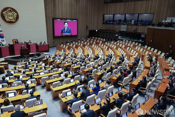 [서울=뉴스핌] 윤창빈 기자 = 이재명 대통령이 4일 오전 서울 여의도 국회에서 2026년도 예산안에 대한 시정연설을 하고 있다. 2025.11.04 pangbin@newspim.com