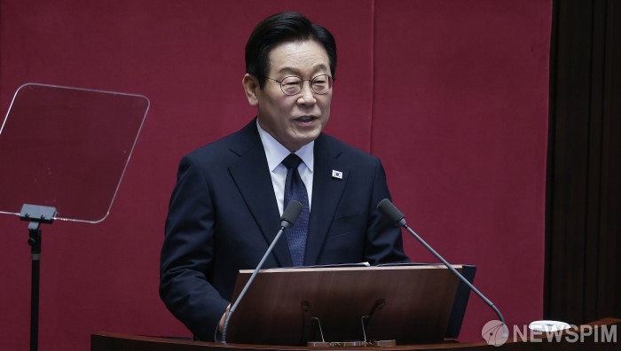 [서울=뉴스핌] 윤창빈 기자 = 이재명 대통령이 4일 오전 서울 여의도 국회에서 2026년도 예산안에 대한 시정연설을 하고 있다. 2025.11.04 pangbin@newspim.com