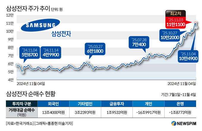 [서울=뉴스핌] 이나영 기자= 삼성전자가 '11만전자'를 찍으며 불과 4개월 만에 주가를 60% 넘게 끌어올렸다. 기대를 웃돈 실적 반등과 잇따른 호재가 상승세를 견인한 가운데, 증권사를 중심으로 한 기관투자자와 사모펀드가 주가 급등을 이끌었다. 외국인은 뒤늦게 매수에 나섰지만, 상승 초기 흐름의 주역은 아니었다.