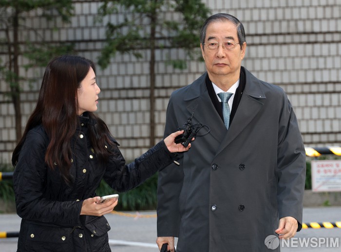 [서울=뉴스핌] 정일구 기자 = 내란 우두머리 방조 혐의를 받는 한덕수 전 국무총리가 5일 오전 서울 서초구 서울중앙지방법원에서 열린 6차 공판에 출석하고 있다. 2025.11.05 mironj19@newspim.com