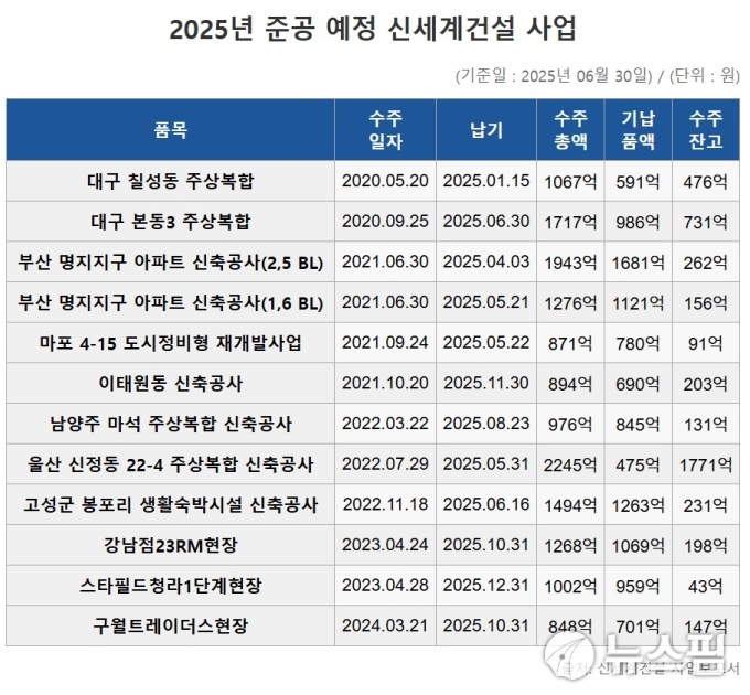 6일 업계에 따르면 신세계건설이 올해 상반기 매출을 견인한 주요 사업 24건(도급액이 2024년 말 연결기준 매출의 5% 이상) 중 12건은 준공 예정일이 연내로 잡혀 있다. 이 중 9건은 이미 공사가 완료됐고, 2건은 이달 말, 1건은 다음 달 준공 예정이다.
