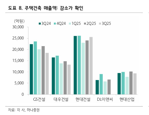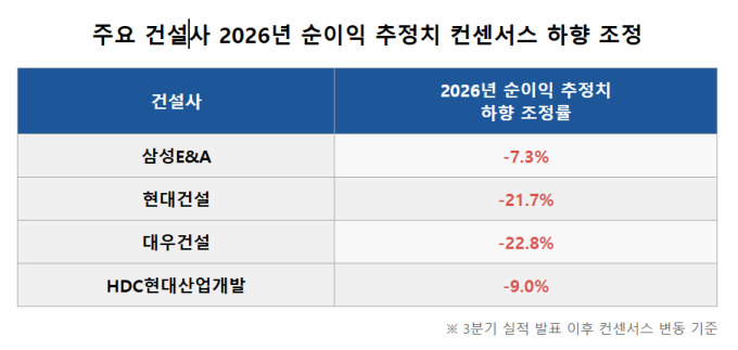 6일 하나증권의 월간 건설 리포트에 따르면 주요 건설사들의 3분기 실적 발표 이후 증권가의 2026년 순이익 추정치 컨센서스는 일제히 하향 조정됐다. 대우건설이 -22.8%로 가장 컸으며, 현대건설이 -21.7%로 뒤를 이었다. 이 외에도 HDC현대산업개발(-9.0%), 삼성E&A(-7.3%) 등 전반적인 눈높이가 낮아졌다.