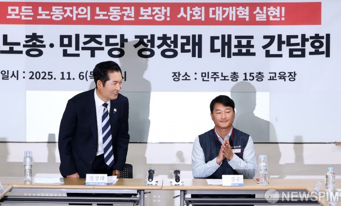 [서울=뉴스핌] 최지환 기자 = 정청래 더불어민주당 대표가 6일 오전 서울 중구 민주노총에서 열린 민주노총·민주당 정청래 대표 간담회에서 참석자들에게 인사하고 있다. 2025.11.06 choipix16@newspim.com