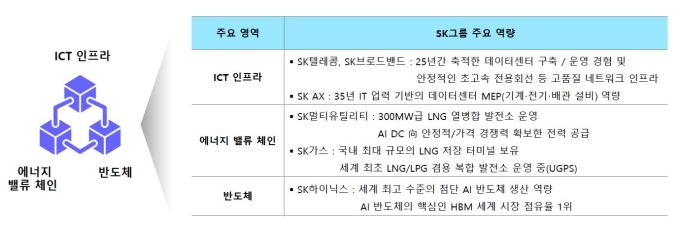최고 수준의 울산 AI 데이터센터 구축에는 ICT(SK텔레콤, SK브로드밴드, SK AX), 에너지(SK가스, SK멀티유틸리티), 반도체(SK하이닉스) 등 SK그룹의 모든 역량이 결집될 예정이다.