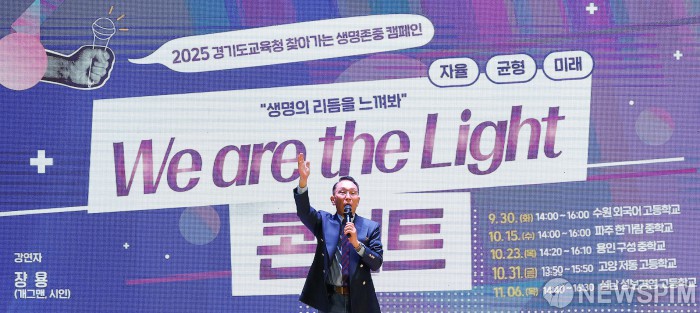 [성남=뉴스핌] 류기찬 기자 = 개그맨 장용이 6일 오후 경기 성남시 수정구 성보경영고등학교에서 열린 '2025 경기도교육청 찾아가는 생명존중 캠페인'에서 사회를 맡고 있다. 2025.11.06 ryuchan0925@newspim.com