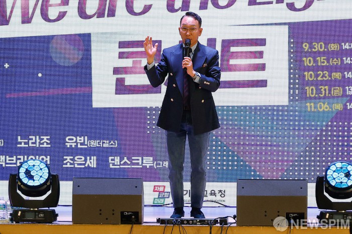 [성남=뉴스핌] 류기찬 기자 = 개그맨 장용이 6일 오후 경기 성남시 수정구 성보경영고등학교에서 열린 '2025 경기도교육청 찾아가는 생명존중 캠페인'에서 사회를 맡고 있다. 2025.11.06 ryuchan0925@newspim.com