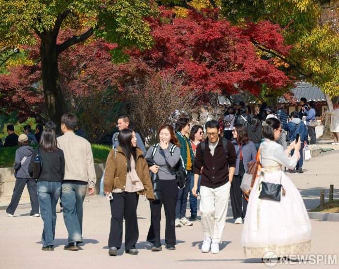 [서울=뉴스핌] 류기찬 기자 = 포근한 날씨를 보이고 있는 7일 오전 서울 종로구 경복궁을 찾은 관광객들이 단풍놀이를 즐기고 있다. 2025.11.07 ryuchan0925@newspim.com