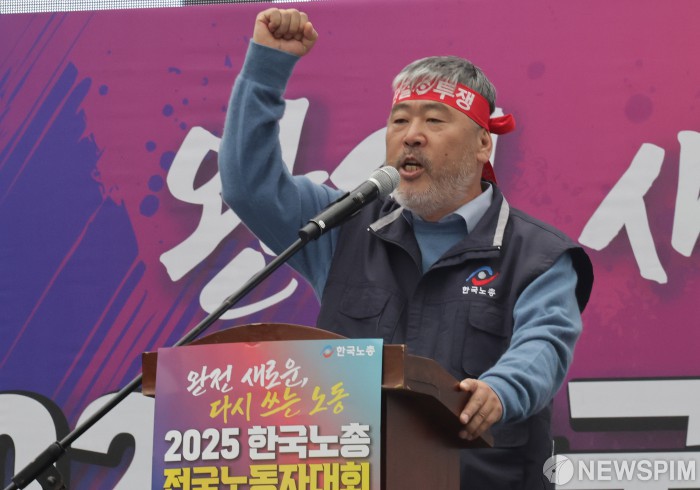 [서울=뉴스핌] 양윤모 기자 =김동명 한국노총위원장이 8일 오후 서울 영등포구 여의대로에서 열린 '2025 한국노총 전국노동자대회'에서 정년 만 65세 연장 법제화와 주 4.5일제 시행 등을 촉구하는 대회사를 하고 있다. 2025.11.08 yym58@newspim.com