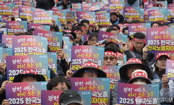 [서울=뉴스핌] 양윤모 기자 =한국노총 조합원들이 8일 오후 서울 영등포구 여의대로에서 열린 '2025 한국노총 전국노동자대회'를 개최하고 정년 만 65세 연장 법제화와 주 4.5일제 시행 등을 촉구했다. 2025.11.08 yym58@newspim.com