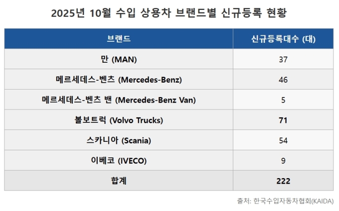 [서울=뉴스핌] 김승현 기자 = 한국수입자동차협회(KAIDA)는 2025년 10월 수입 상용차 신규등록대수가 222대로 집계됐다고 밝혔다. 올해 1~10월 누적 대수는 3263대다.