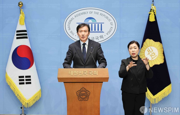 [서울=뉴스핌] 윤창빈 기자 = 조국 전 조국혁신당 비상대책위원장이 10일 오전 서울 여의도 국회에서 당대표 출마 선언을 하고 있다. 2025.11.10 pangbin@newspim.com