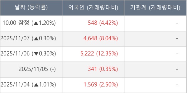 [서울=뉴스핌] 로보뉴스 = 10일 10시 15분 현재 PN풍년(024940)은 전일 대비 1.20% (현재가 5,060원) 상승했고, 외국인이 최근 5일 연속 순매수(누적 12,328주, 잠정) 행진을 하고 있다.
