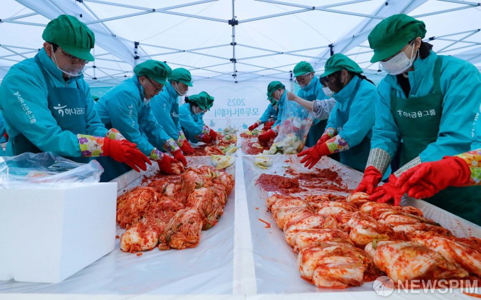 [서울=뉴스핌] 류기찬 기자 = 하나금융그룹 임직원들이 10일 오전 서울 중구 하나금융그룹 명동사옥에서 열린 ‘2025년 모두하나데이 사랑의 김장나눔’ 행사에서 김장을 하고 있다. 2025.11.10 ryuchan0925@newspim.com