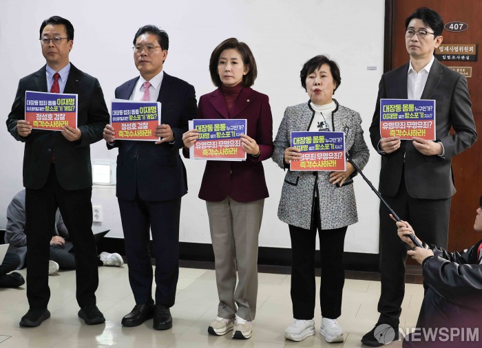 [서울=뉴스핌] 윤창빈 기자 = 나경원 국민의힘 의원을 비롯한 국회 법제사법위원회 소속 의원들이 10일 서울 여의도 국회에서 열린 이재명 측근 대장동 비리 사건 항소 포기 관련 추미애 위원장 법사위 개의요구 거부에 대한 규탄 및 기자회견에서 피켓을 들고 있다. pangbin@newspim.com