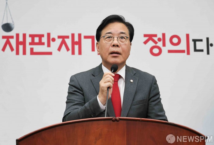[서울=뉴스핌] 윤창빈 기자 = 송언석 국민의힘 원내대표가 10일 서울 여의도 국회에서 열린 의원총회에서 모두발언을 하고 있다. pangbin@newspim.com