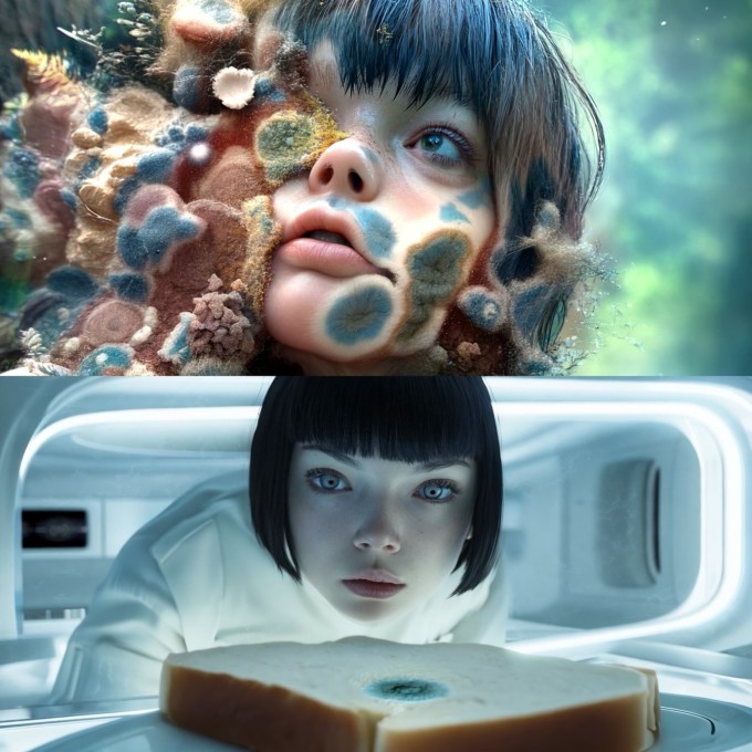 곰팡이는 인류가 만들어낸 '오염'을 감각의 회복과 생명의 재생으로 재해석한 작품이다. 전 장면이 ComfyUI, Midjourney, Kling 등 다양한 생성형 AI 도구를 기반으로 구현돼, 인간의 연출 의도와 알고리즘의 자율적 생성이 결합해 독특한 영상미를 완성했다.