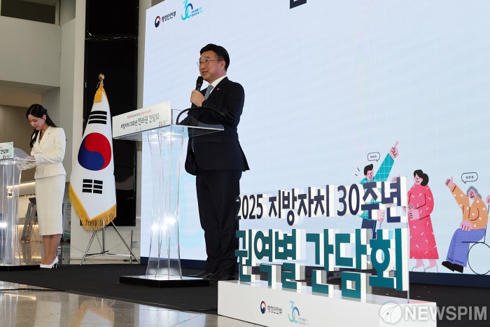 [서울=뉴스핌] 윤호중 행정안전부 장관이 11일 오후 광주광역시청에서 열린 주민자치 30주년 기념 전라권 간담회에 참석하여 인사말을 하고 있다. [사진=행정안전부] 2025.11.10 photo@newspim.com