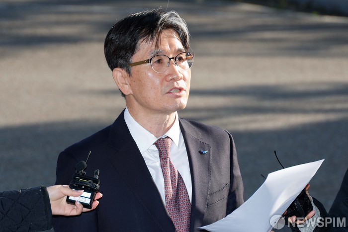 [과천=뉴스핌] 류기찬 기자 = 오동운 고위공직자범죄수사처장이 11일 오전 경기 과천시 정부과천청사 공수처로 출근하며 입장을 밝히고 있다. 2025.11.11 ryuchan0925@newspim.com