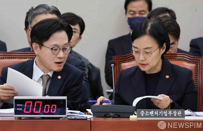 [서울=뉴스핌] 윤창빈 기자 = 김정관 산업통상부 장관, 한성숙 중소벤처기업부 장관이 11일 서울 여의도 국회에서 열린 산업통상자원중소벤처기업위원회 전체회의에서 대화를 나누고 있다. 2025.11.11 pangbin@newspim.com