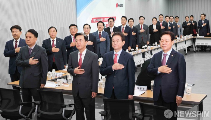 [서울=뉴스핌] 윤창빈 기자 = 장동혁 국민의힘 대표, 송언석 원내대표를 비롯한 시·도 광역단체장들이 12일 서울 여의도 국민의힘 중앙당사에서 열린 지방선거총괄기획단 및 시·도 광역단체장 연석회의에서 국민의례를 하고 있다. 2025.11.12 pangbin@newspim.com