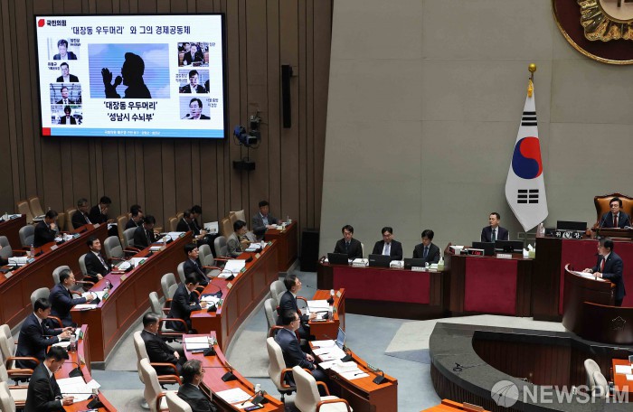 [서울=뉴스핌] 윤창빈 기자 = 정성호 법무부 장관이 12일 서울 여의도 국회에서 열린 예산결산특별위원회 전체회의에서 배준영 국민의힘 의원의 대장동 재판 항소 포기와 관련한 질문에 답변하고 있다. 2025.11.12 pangbin@newspim.com