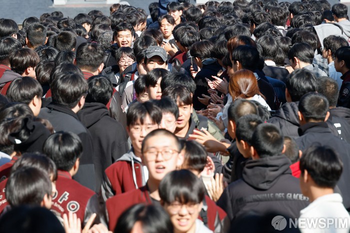 [서울=뉴스핌] 류기찬 기자 = 2026학년도 대학수학능력시험을 하루 앞둔 12일 오전 서울 종로구 중앙고등학교에서 열린 장행식에서 고3 수험생들이 후배들과 선생님들의 응원을 받으며 교정을 나서고 있다. 2025.11.12 ryuchan0925@newspim.com