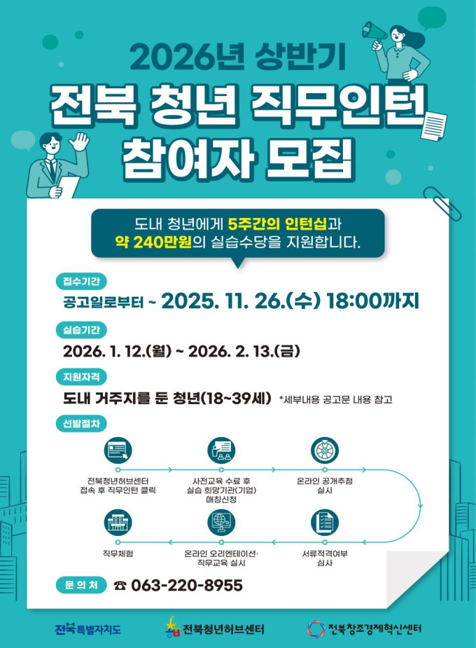 [전주=뉴스핌] 이백수 기자 = 전북특별자치도가 내년 상반기 청년 직무인턴 참여자 215명을 오는 26일까지 모집한다고 12일 밝혔다.