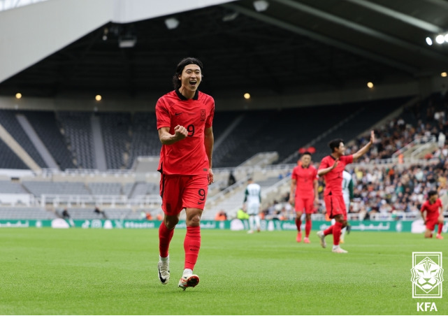 | 조규성이 2023년 9월에 열린 사우디아라비아와 평가전에서 헤더 결승골을 넣고 기뻐하고 있다. [사진 = KFA] |