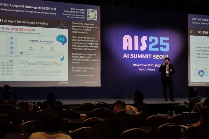 | [서울=뉴스핌] 김연순 기자 = 비아이매트릭스가 AI 서밋 서울 & 엑스포 2025에서 '데이터를 분석하는 AI 에이전트와 온톨로지 의사결정의 미래'라는 주제로 발표를 진행했다 [사진=비아이매트릭스] 2025.11.12 y2kid@newspim.com |