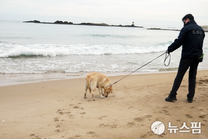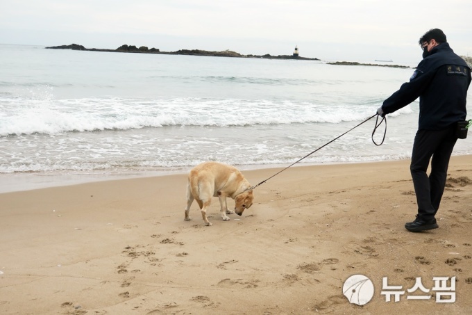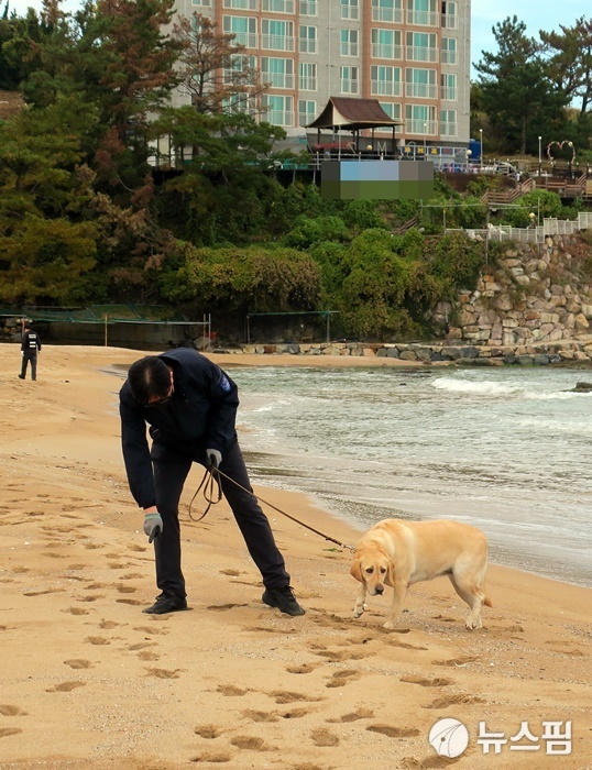 [포항=뉴스핌] 남효선 기자 = 경북 포항 연안 해변에서 마약류 의심 물질이 잇따라 발견되면서 관계 당국에 비상이 걸린 가운데 포항해양경찰서가 12일, 포항시 북구 칠포~월포 해변 일대에서 수색견을 투입해 마약류 수색을 전개하고 있다. 이날 합동 수색에는 포항해경과 50사단 장병, 해양재난구조대, 드론수색대, 한국해양안전협회 등 유관 기관 70여 명과 대구세관 마약탐지견 1두가 투입됐다. 이번 해경의 대대적인 합동 수색은 최근 포항 인근 해변에서 마약류 의심 물질이 잇따라 발견되면서 일반인 노출 등 2차 피해를 사전에 차단키 위해 마련됐다. 수색은 이날 오후 5시까지 포항시 북구 흥해읍 칠포리~청하면 방어리 해안 5~10㎞ 권역에 걸쳐 입체적으로 진행된다.2025.11.12 nulcheon@newspim.com