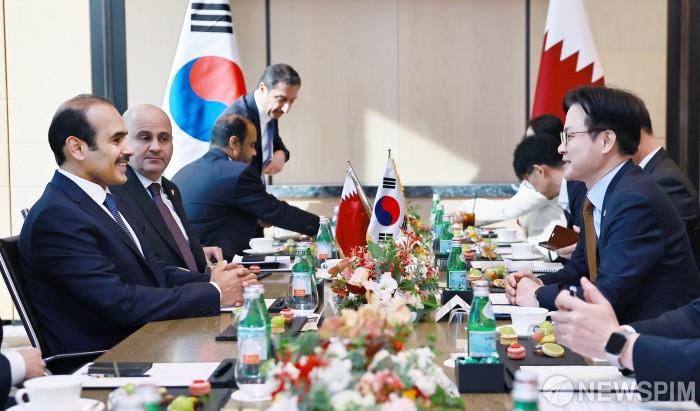 [서울=뉴스핌] 김정관 산업통상부 장관이 12일 서울 종로구 포시즌스호텔에서 알 카비(Al Kaabi) 카타르 에너지 담당 국무장관과 회담을 하고 있다. 이날 회담에서 에너지 공급망 협력을 중심으로 양국 간 협력 강화 방안을 논의했다. [사진=산업통상부] 2025.11.12 photo@newspim.com