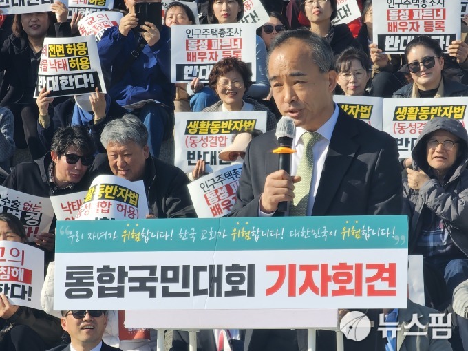 기독교 성향 시민단체인 거룩한방파제통합국민대회(통합국민대회)가 12일 서울 여의도 국회 본관 앞 계단에서 최근 발의된 복수의 법안에 대한 반대 기자회견을 개최했다
