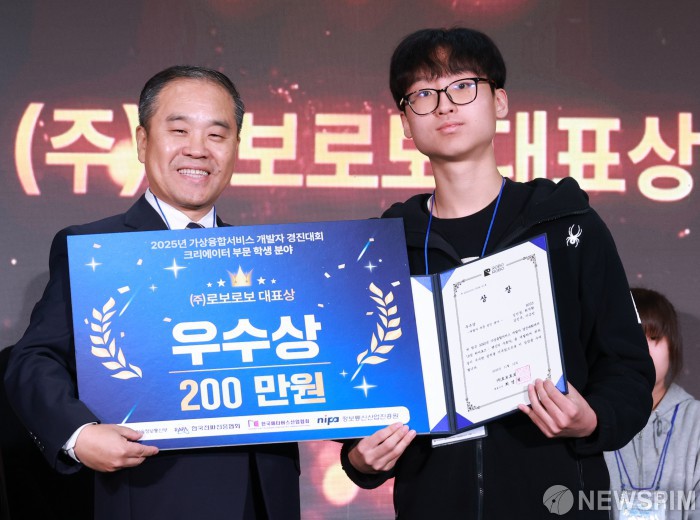 [고양=뉴스핌] 김학선 기자 = 12일 경기 고양시 킨텍스에서 열린 2025 대한민국 가상융합산업대전(KMF2025)에서 '2025년 가상융합서비스 개발자 경진대회' 개발자 부문 성인 분야 우수상을 수상한 'BIG3' 팀이 기념촬영을 하고 있다. 'AI와 만난 가상융합, 모두의 일상이 되다!'를 주제로 열린 'KMF2025'는 오는 14일까지 3일간 진행된다. 2025.11.12 yooksa@newspim.com