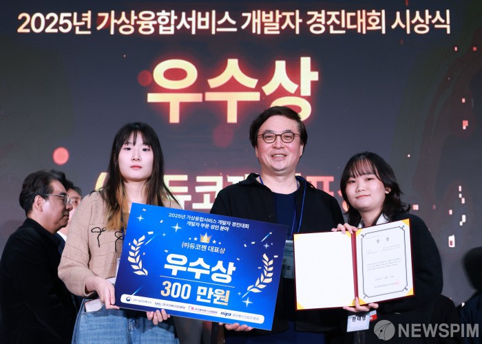 [고양=뉴스핌] 김학선 기자 = 12일 경기 고양시 킨텍스에서 열린 2025 대한민국 가상융합산업대전(KMF2025)에서 '2025년 가상융합서비스 개발자 경진대회' 개발자 부문 성인 분야 우수상을 수상한 '나는 오늘 최애를 만난다' 팀이 기념촬영을 하고 있다. 'AI와 만난 가상융합, 모두의 일상이 되다!'를 주제로 열린 'KMF2025'는 오는 14일까지 3일간 진행된다. 2025.11.12 yooksa@newspim.com