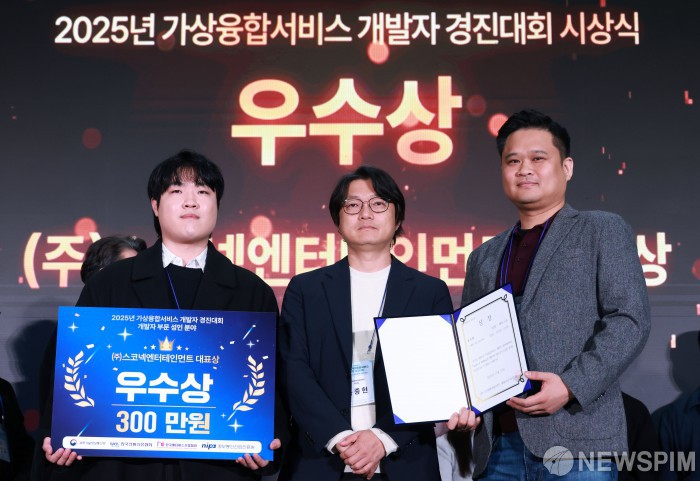 [고양=뉴스핌] 김학선 기자 = 12일 경기 고양시 킨텍스에서 열린 2025 대한민국 가상융합산업대전(KMF2025)에서 '2025년 가상융합서비스 개발자 경진대회' 개발자 부문 성인 분야 우수상을 수상한 메가스톤 팀이 기념촬영을 하고 있다. 'AI와 만난 가상융합, 모두의 일상이 되다!'를 주제로 열린 'KMF2025'는 오는 14일까지 3일간 진행된다. 2025.11.12 yooksa@newspim.com
