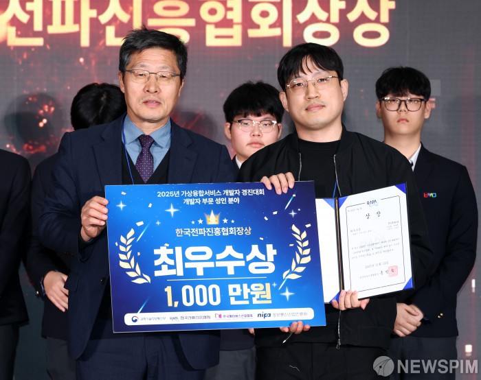 [고양=뉴스핌] 최지환 기자 = 12일 경기 고양시 킨텍스에서 열린 2025 대한민국 가상융합산업대전(KMF2025) 가상융합서비스 개발자 경진대회 개발자 부문 성인 분야 최우수상을 수상한 PoXang팀이 양용열 한국전파진흥협회 사무총장과 기념촬영을 하고 있다. 'AI와 만난 가상융합, 모두의 일상이 되다!'를 주제로 열린 'KMF2025'는 오는 14일까지 3일간 진행된다. 2025.11.12 choipix16@newspim.com