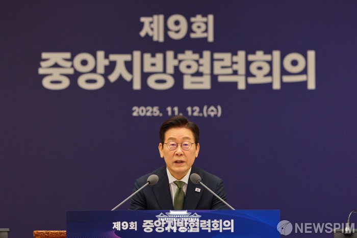 [서울=뉴스핌] 이재명 대통령이 12일 서울 용산 대통령실에서 열린 제9회 중앙지방협력회의에서 발언하고 있다. [사진=대통령실] 2025.11.12 photo@newspim.com