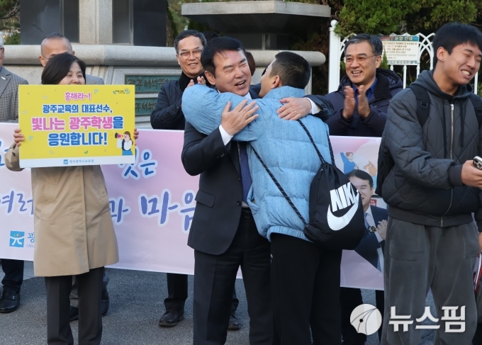 [광주=뉴스핌] 박진형 기자 = 2026학년도 대학수학능력시험이 치러진 13일 오전 광주 서석고등학교에서 이정선 광주시교육감이 수험생을 포옹하며 응원하고 있다. 2025.11.13 bless4ya@newspim.com