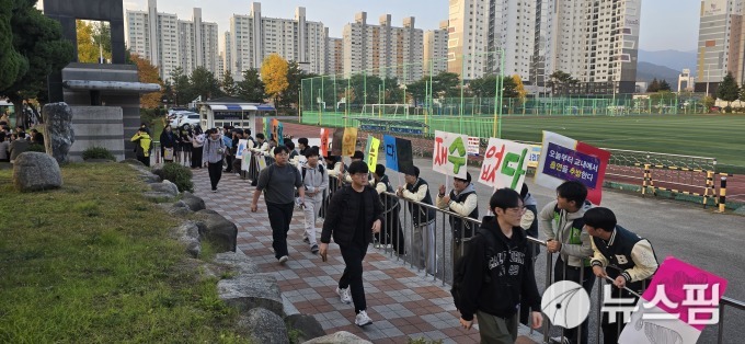 | [동해=뉴스핌] 이형섭 기자 = 강원 동해시 각 고등학교 재학생들이 북평고등학교 정문에서 2026학년도 대학수학능력시험에 응시하는 고3 선배들을 응원하고 있다. 2025.11.13 onemoregive@newspim.com |