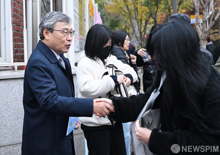 [서울=뉴스핌] 사진공동취재단 = 정근식 서울시교육감이 2026학년도 대학수학능력시험일인 13일 오전 서울 광진구 광남고등학교 입구에서 수험생들을 응원하며 악수하고 있다. 2025.11.13 photo@newspim.com