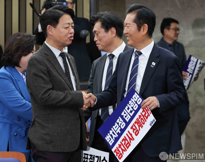 [서울=뉴스핌] 윤창빈 기자 = 정청래 더불어민주당 대표가 13일 서울 여의도 국회에서 열린 의원총회에 참석하며 김영호 의원과 인사하고 있다. 2025.11.13 pangbin@newspim.com