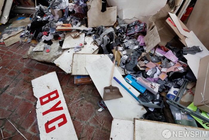 [부천=뉴스핌] 류기찬 기자 = 13일 경기 부천시 오정구 제일시장에서 A씨가 몰던 1톤 트럭이 돌진하는 사고가 발생한 가운데 사고 현장이 처참한 모습을 보이고 있다. 2025.11.13 ryuchan0925@newspim.com